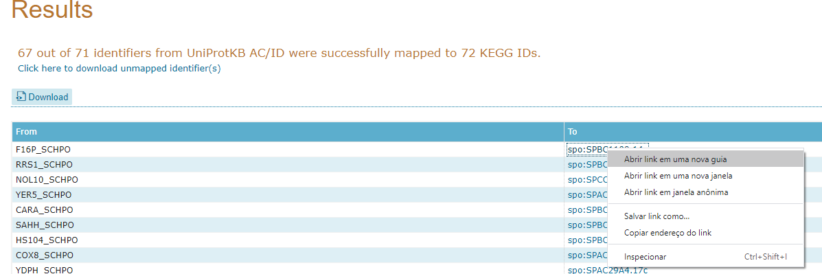 Vamos explorar alguma dessas vias. Clique na primeira opção de KEGG com o botão direito e vá em Abrir em uma nova guia: