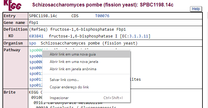 A partir daqui nós podemos visualizar todas as vias metabólicas que este gene está envolvido, como por exemplo, a spo00010 Glycolysis/Gluconeogenesis. Vamos fazer o mesmo procedimento poder abrir este link em uma nova aba do navegador: