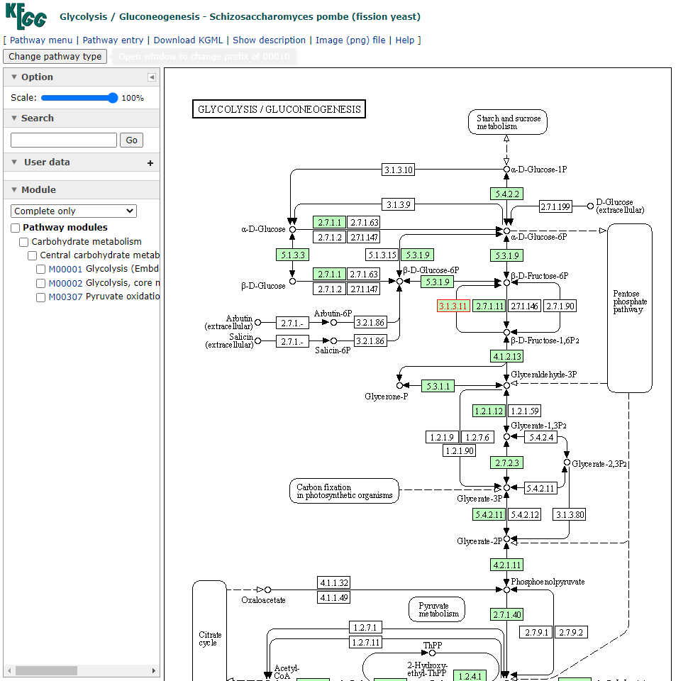 Nesta nova aba aberta agora podemos explorar em qual região da via este gene está com sua expressão diferenciada. Neste caso, está em vermelho o número 3.1.3.11 dentro da parte de Pentose phophate pathway.