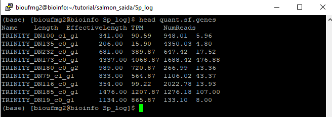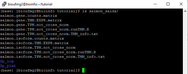 Ao final do processo, irá ser criado uma pasta chamada salmon_saida com duas pastas: Sp_log e Sp_plat, contendo todos os resultados obtidos pelo Salmon: