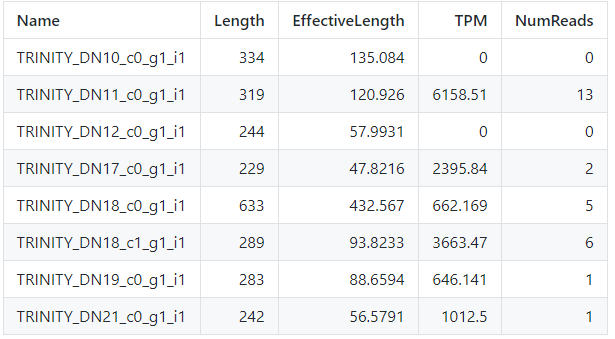 Estes arquivos são separados por tabulações e possuem colunas das quais podemos identificar o nome do transcrito/gene, o tamanho, e o valores de TPM e de suas reads: