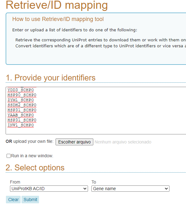 Cole o texto que você copiou do PuTTY (ctrl + v) na região do Provide your identifiers; selecione, na parte de Select Options, To Gene Name. Por fim, clique em Submit.